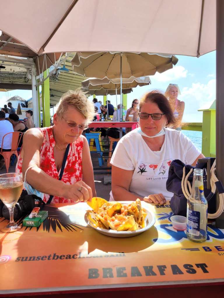 Während der Zeit, die wir dort verbringen, kommen mehr kleinere Maschinen über den Strand hereingeflogen. Es ist schon beeindruckend, wie tief die Flieger über den Strand Richtung Landebahn fliegen. Es ist windig und wir vertreiben uns die Zeit mit einem Drink und einem kleinen Snack. Der Wind kippt mein Weinglas um. Erinnerungen!!!