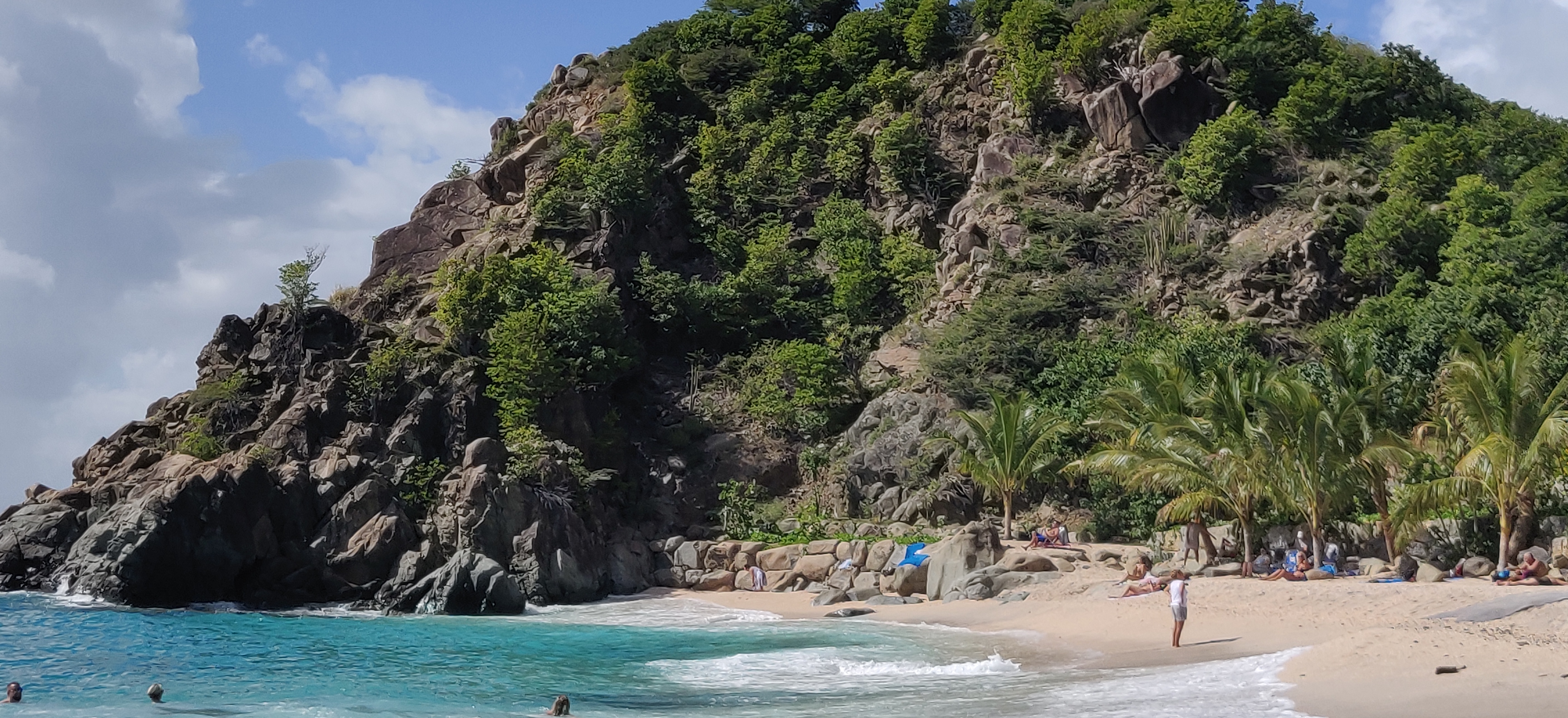 Gert und Andy steigen am Hafen von Gustavia aus und wir drei Frauen lassen uns weiter zum Shell Beach fahren. Sehr schön aber relativ voll und heiß! Ab und zu kommen ein paar Tropfen runter. Wir sammeln Muscheln, schwimmen und genießen die Zeit.