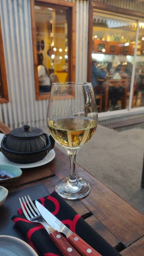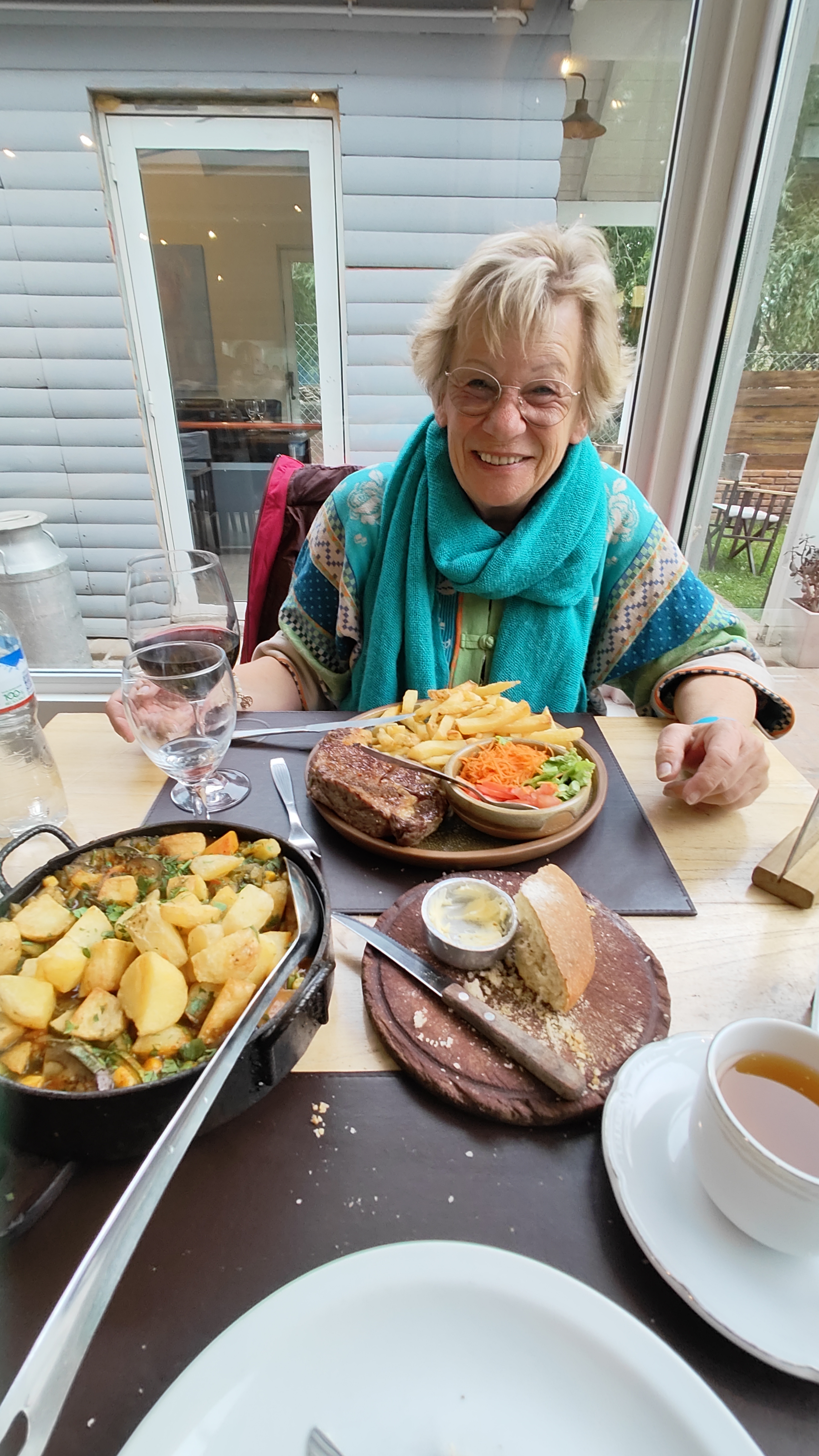 Sie sucht etwas Schönes aus, was wir nicht sofort finden. Aber letztendlich essen wir gut aber auch teuer. Das ist in Patagonien so. Es ist teurer als hier in Südfrankreich.